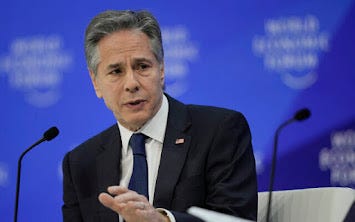 Από όλες τις μάσκες σε αυτή τη μασκαράτα, αυτή του Antony Blinken (σημερινός υπουργός εξωτερικών των ΗΠΑ - φώτο) ήταν ίσως η πιο αφηγηματική. Η προσωπική του παρακμή και οι λόγοι που το δείχνει τόσο εμφανώς, είναι συνυφασμένοι με την εξασθένιση της σημασίας του ίδιου του WEF.