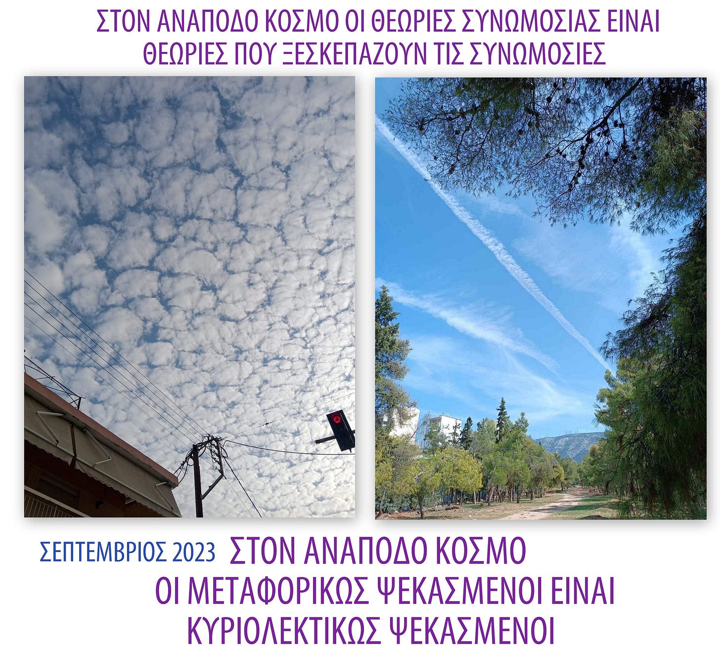 Τολμάς να αμφισβητείς ότι ο ελληνικός ουρανός τις τελευταίες δύο ημέρες (14-15 Σεπτεμβρίου 2023) έχει γεμίσει πάλι από συνήθη-αθώα ίχνη συμπύκνωσης των αεροπλάνων (contrails) και, αντ’ αυτού, πιστεύεις ότι έχει γίνει μπακλαβαδωτός ή μπαμπακωτός από επιβλαβή χημικά ίχνη (chemtrails);1